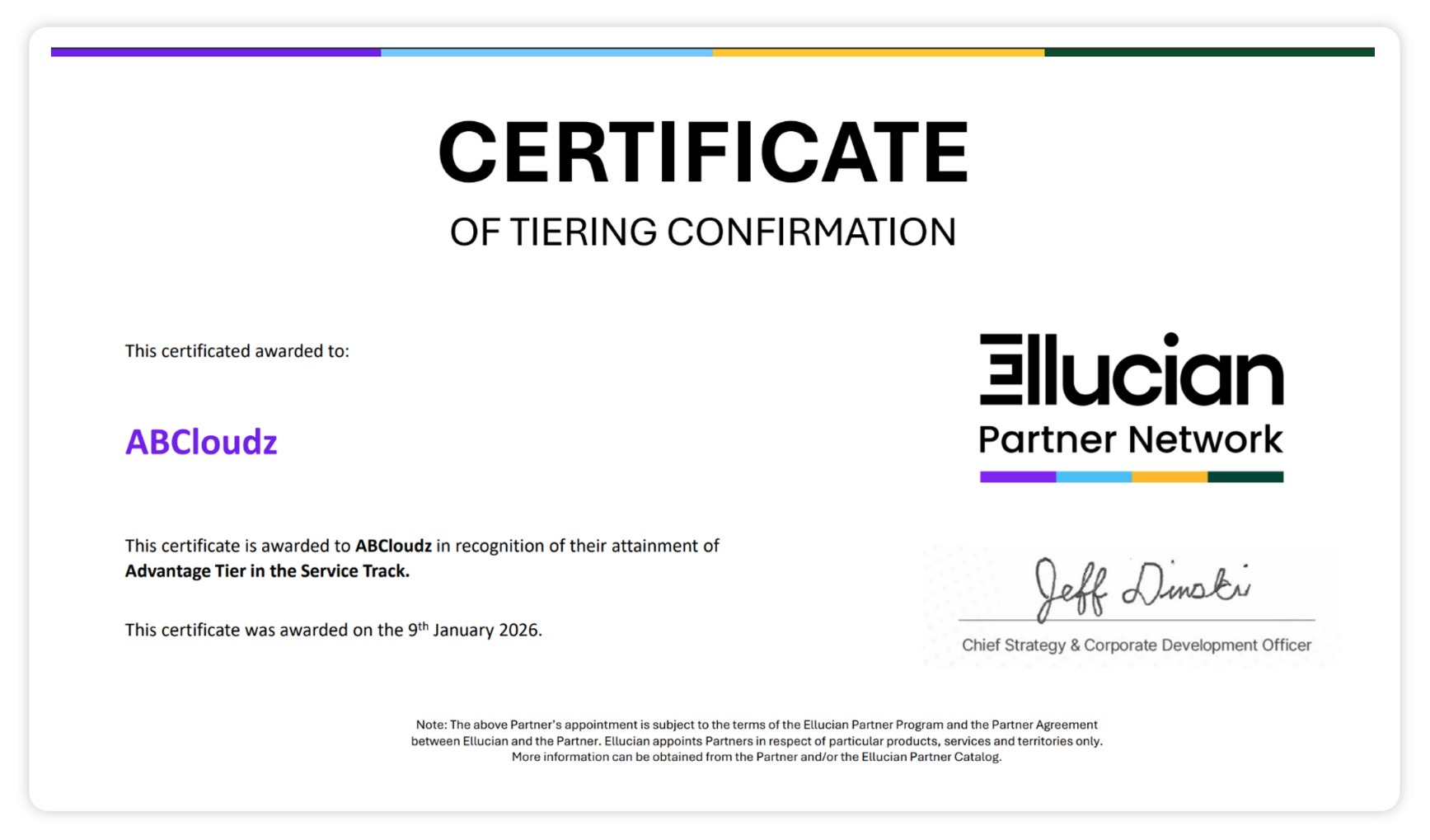 ABCloudz has achieved Advantage Tier status in the Ellucian Service Track. This milestone is formally confirmed by Ellucian through a Certificate of Tiering Confirmation and reflects the maturity and consistency of our service capabilities within the Ellucian ecosystem.