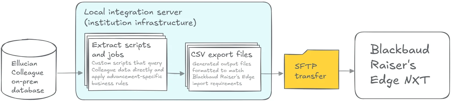 The original setup was built around an on-prem environment. Data could be queried directly. Jobs ran on local schedules. File delivery relied on infrastructure the institution controlled. That approach worked then because Colleague allowed it.