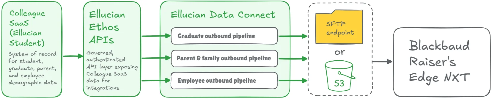 In Ellucian SaaS, Colleague data is no longer something you query directly. Ethos APIs become the access point. From there, Ellucian Data Connect handles execution. Scheduled outbound pipelines pull the required data sets, apply the same selection rules and mappings the institution already relied on, and check the results before anything is sent out.