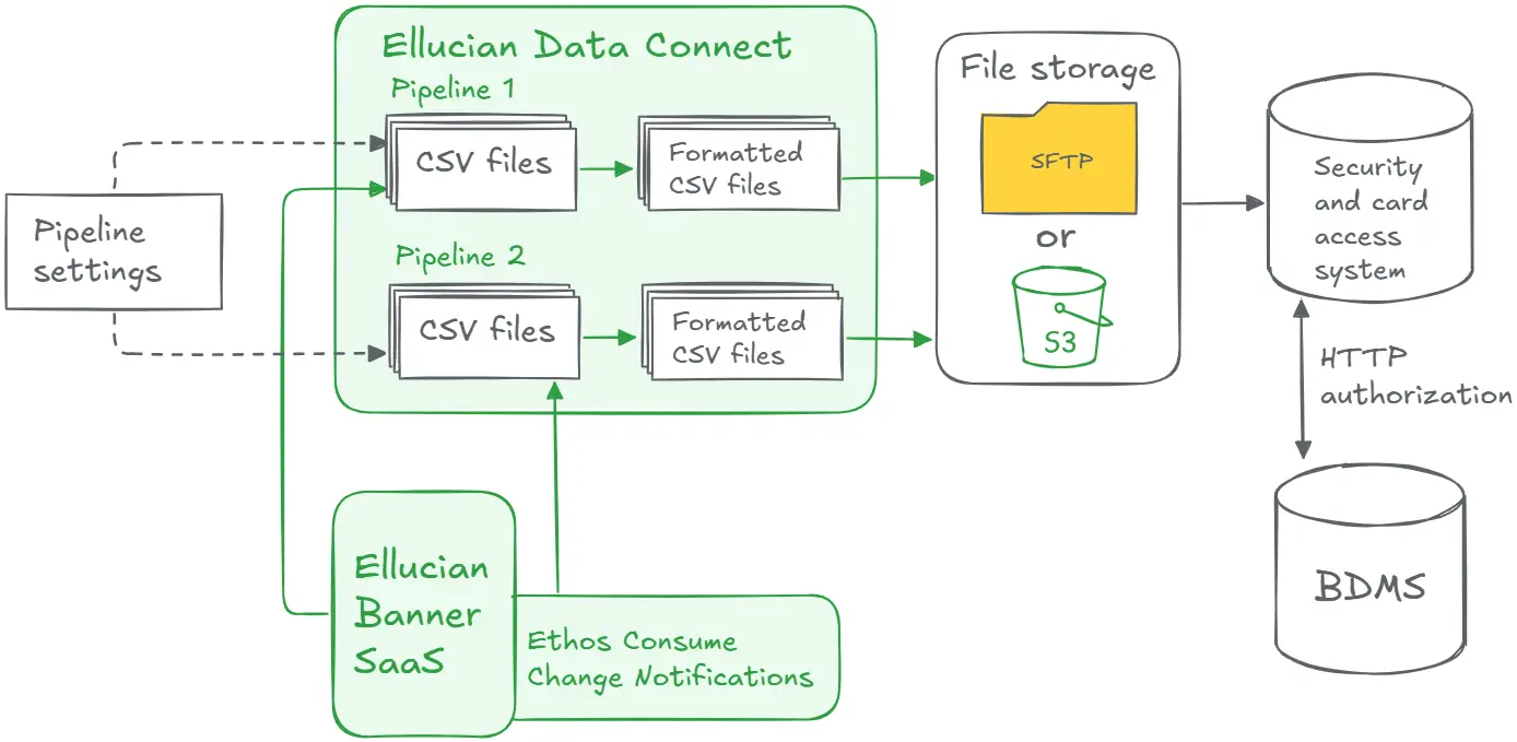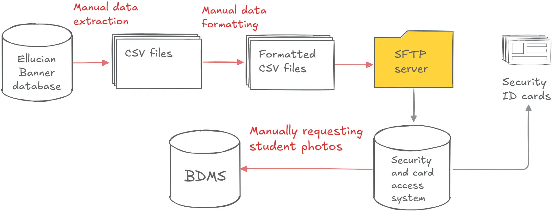 At the first step, manual SQL scripts extract data from the on-premises Banner database. Next, the database administrators format the extracted CSV files into a compatible format for the security and card access system. After uploading these files to the SFTP server, the administrators of this security and card access system run HTTP requests to get student photos.