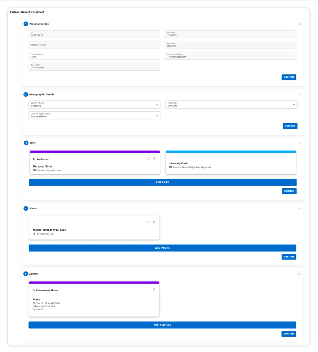Each section focuses on one thing at a time, with clear progress and no unrelated screens. Students review personal and demographic details first, then confirm or update contact information such as email, phone, and address. Only a limited number of fields are editable. Everything else is clearly shown as read-only, so there is no confusion about what can be changed.