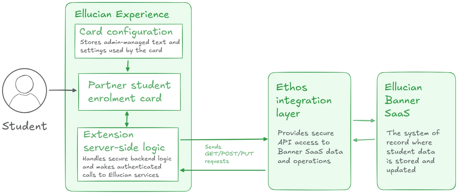 All reads and updates go through the Ethos integration layer, which provides secure API access to Banner SaaS using standard operations. Banner remains the system of record, storing confirmed updates and terms acceptance as soon as the student completes each step.