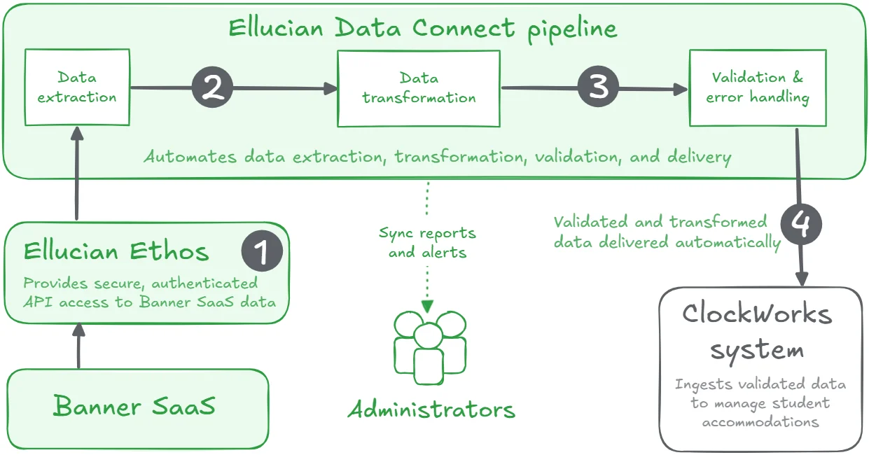 That was exactly the case for a large community college in the United States with tens of thousands of students using ClockWorks alongside Banner. After the migration, the old on-prem integration no longer worked because direct database access was no longer available. Our task was to reimplement the connection using Ellucian’s cloud-native tools, Data Connect and Ethos, to restore full synchronization between the two systems