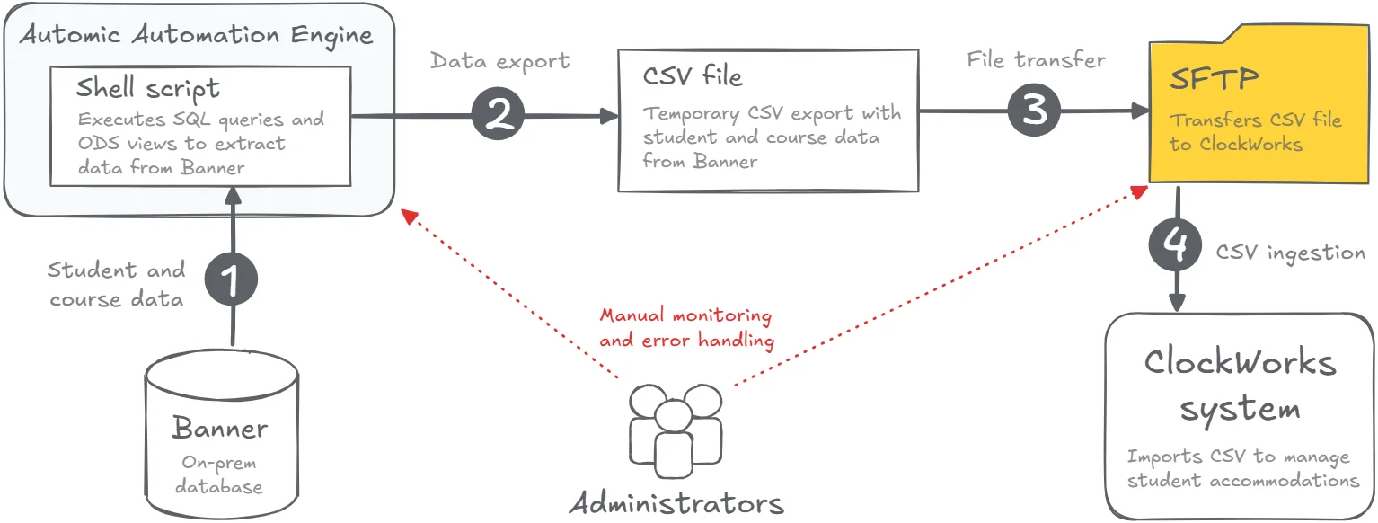 Before the migration, ClockWorks communicated with the Banner On-Prem database through a custom integration based on SQL scripts, ODS views, and nightly SFTP transfers. It was reliable for its time, but it depended on direct database access and locally managed servers, both of which are not available in the SaaS environment.