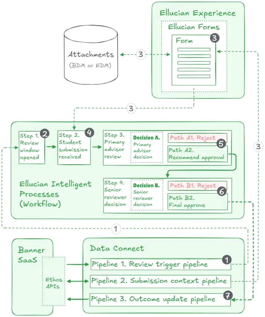 In the sections below, we show how this process is implemented using Ellucian Experience, Forms, Intelligent Processes, and Data Connect, turning a traditionally manual review into a clear, repeatable SaaS workflow.