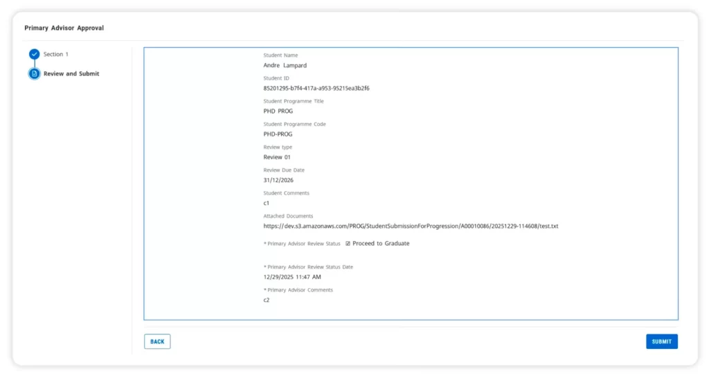 Students get one clear place to complete the annual review, submit comments and attachments, and see the outcome once it is decided. Advisors receive a complete review package with the right milestone context, so they can act without chasing details. The result is fewer follow-ups and a smoother handoff on both sides.