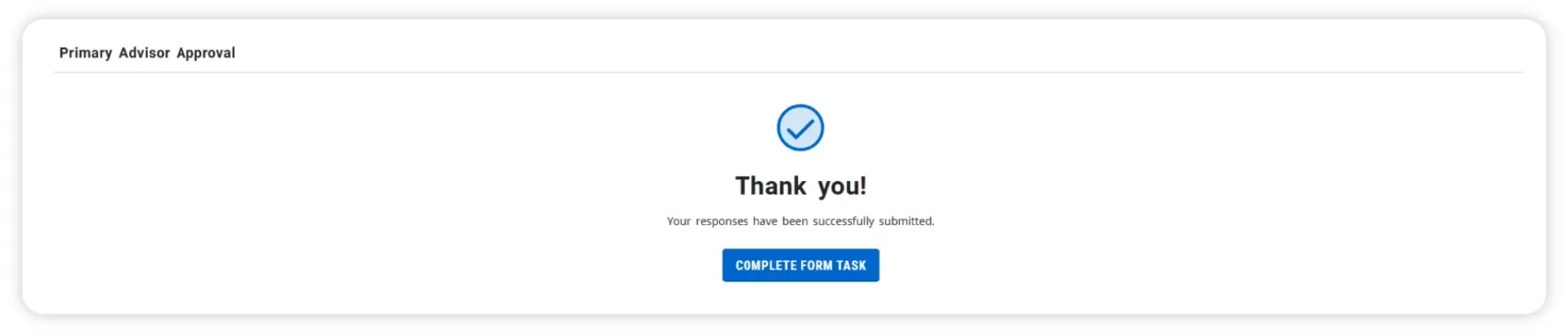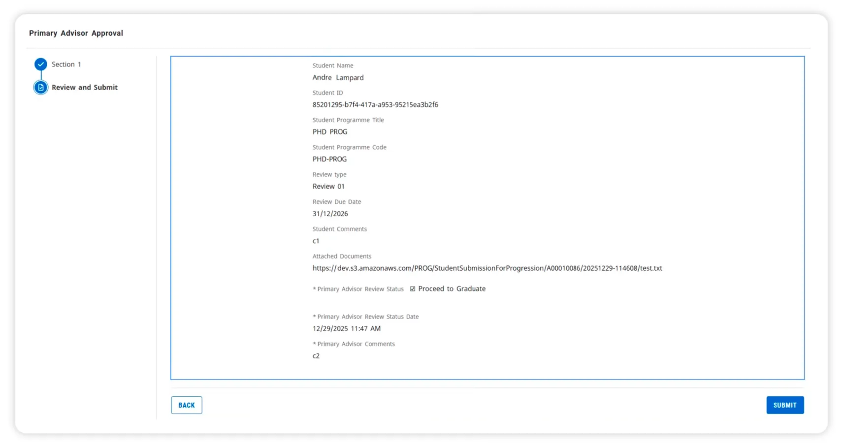 The first approval task goes to the primary advisor identified earlier. The advisor reviews the student’s submission, sees the attached documents, adds comments, and then chooses a path: