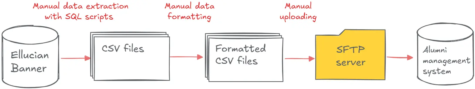 At the first step, database administrators run SQL scripts to extract data from the on-premises Banner database. Next, they manually format these extracted CSV files into an appropriate format that the alumni management system can consume. Finally, the administrators upload these files with formatted data to the SFTP server of the alumni management system.