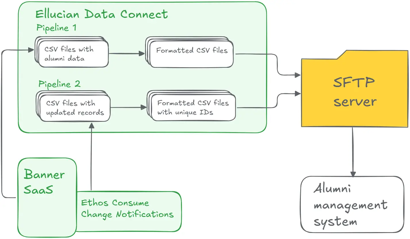 The ABCloudz team used Data Connect and Ethos change-notification subscription to build data pipelines for seamless data integration from Ellucian Banner SaaS into the alumni management system. One of these automated pipelines migrates alumni data, while the other captures changes in the Banner SaaS database and replicates them in the alumni management system.