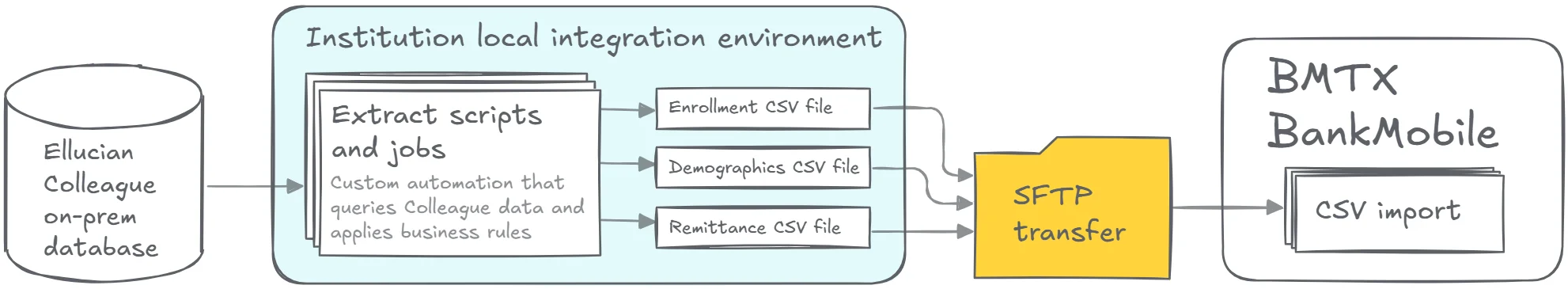 Before Ellucian SaaS entered the picture, the Colleague to BMTX BankMobile integration was comfortably settled into its role. Colleague produced enrollment signals, student demographics, and disbursement data on a schedule. Three CSV files went out. BankMobile picked them up. Refunds and account setup kept moving without anyone having to think about it too much.