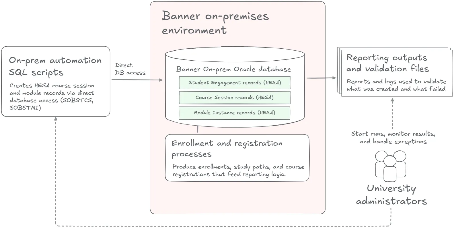 The foundation of that setup was Banner on-premises. Engagement records were created automatically as part of enrollment, while Course Session and Module Instance records were generated through custom logic that lived close to the database. Scripts, SQL, and Banner utilities filled the gaps left by baseline Banner, using direct database access to control exactly when and how HESA-specific records were created.