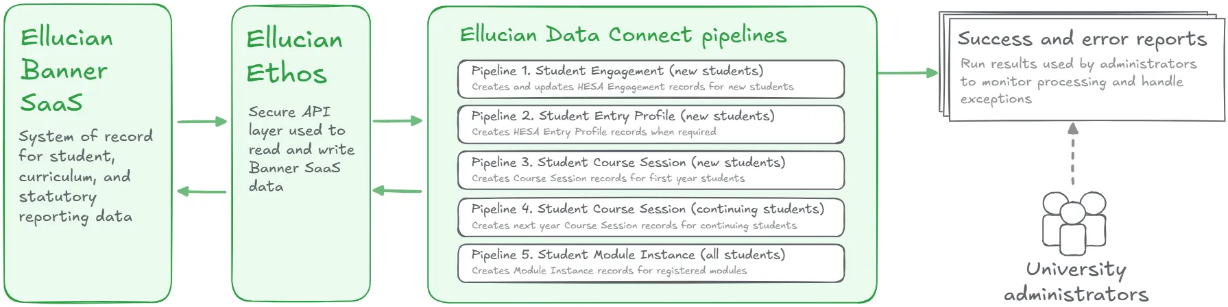 Statutory HESA records are now created natively in Banner SaaS using supported, API-driven automation. The five Data Connect pipelines run on schedule and apply the same reporting rules with predictable results. Engagement, Course Session, and Module Instance data is created only when conditions are met, reducing noise and manual intervention during reporting periods.