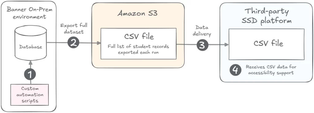 Before the migration, the university already had an automated setup that shared student data with a third-party platform supporting accessibility services for students with disabilities. The integration was built around the on-prem Banner database, using custom scripts and direct queries to keep everything in sync. It worked, but it wasn’t smart. The system moved large amounts of redundant data, sending complete datasets even when only a few records had changed.