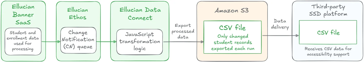 Before the migration, the university already had an automated setup that shared student data with a third-party platform supporting accessibility services for students with disabilities. The integration was built around the on-prem Banner database, using custom scripts and direct queries to keep everything in sync. It worked, but it wasn’t smart. The system moved large amounts of redundant data, sending complete datasets even when only a few records had changed.