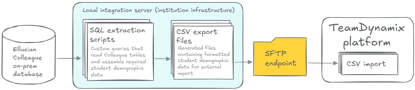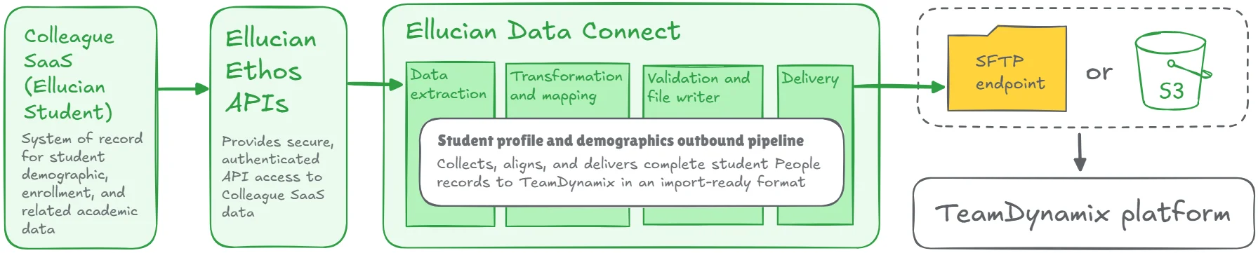 Ellucian Data Connect then takes over as the execution engine. Using Ethos as its source, a scheduled outbound pipeline retrieves student demographic data, applies the same filters and mappings defined in the legacy integration, and validates the results before file creation. The pipeline generates full demographic exports, not deltas, matching the import model supported by TeamDynamix.