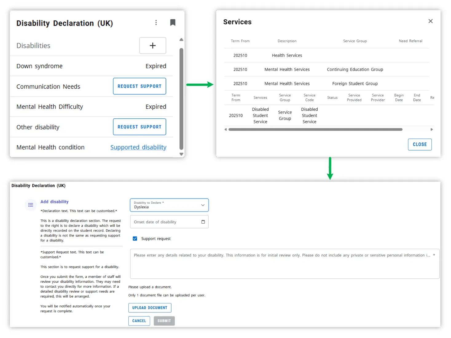 Before the start of this project, the students had to contact the university support to declare a disability and share the medical documents. They printed, filled in, and signed paper forms, bringing them to the support team. At the start of each term, the support team was overloaded with these declarations.