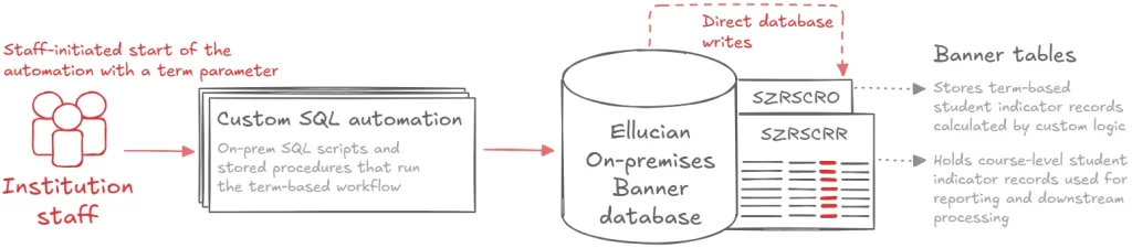 The entire workflow was built around direct database access. SQL scripts queried enrollment and student data, applied business logic close to the source, and wrote updates straight back into Banner. That approach was efficient, predictable, and well understood in an on-prem environment.