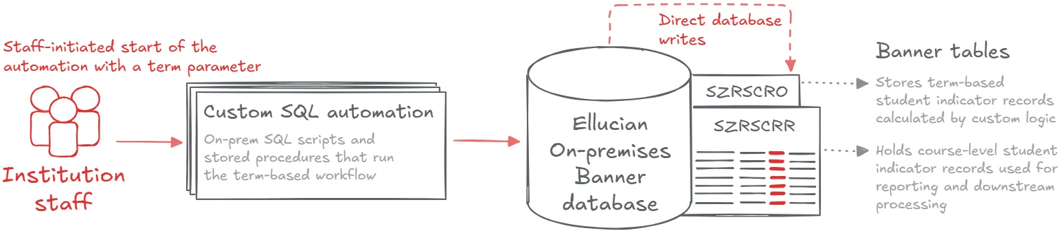 The entire workflow was built around direct database access. SQL scripts queried enrollment and student data, applied business logic close to the source, and wrote updates straight back into Banner. That approach was efficient, predictable, and well understood in an on-prem environment.