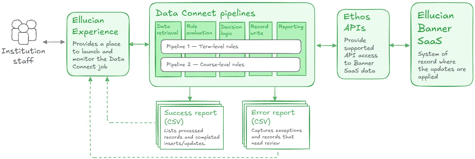 Ellucian Data Connect became the orchestration layer, while Ethos APIs provided controlled access to Banner SaaS. Direct database writes were replaced with authenticated API interactions, aligning every read and update with Ellucian’s supported SaaS model.