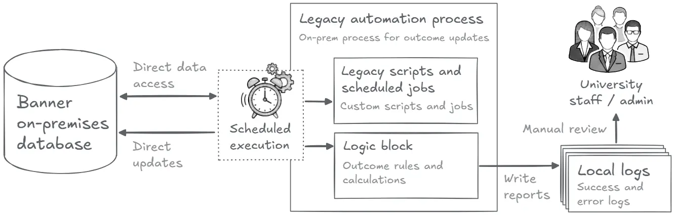 That was exactly the situation here. The institution already had working logic that updated module outcome related values based on student grading data. Academic teams trusted it. The rules were established. The process was already doing real work. But once Banner moved from on-prem to SaaS, the old execution model hit a wall.