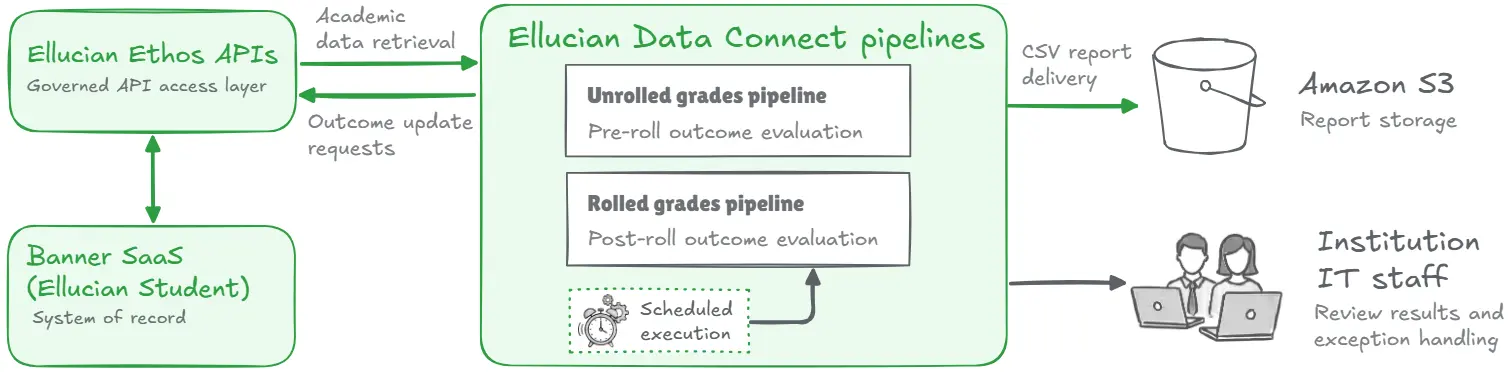 The final architecture combines Ethos for governed API access, Data Connect for orchestration and transformation logic, and S3 for operational reporting. The result is a controlled, repeatable process that preserves academic decision logic while fully aligning with Banner SaaS integration standards.