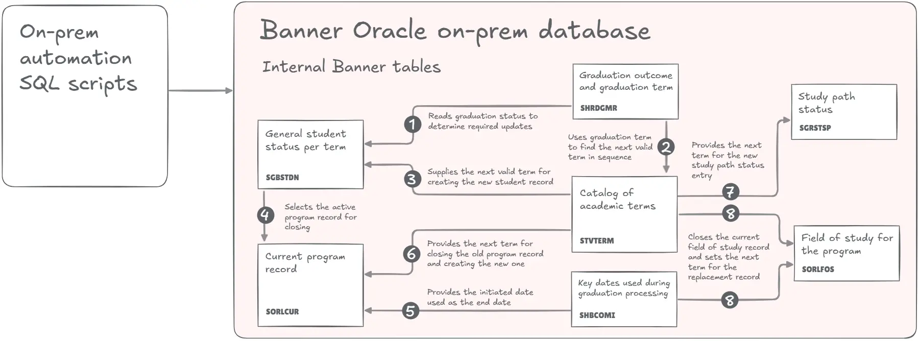 In the on-prem environment, the institution relied on a graduation close out process that updated student and program information directly in Banner’s database. The automation followed a sequence of academic rules that determined when a student finished a program, how their status should change, and which term they should roll into next. When you look at the current state diagram, keep in mind that the arrows illustrate where the scripts read information from rather than any literal movement of data. Each arrow simply shows that one table serves as the source of values used to calculate updates in another.