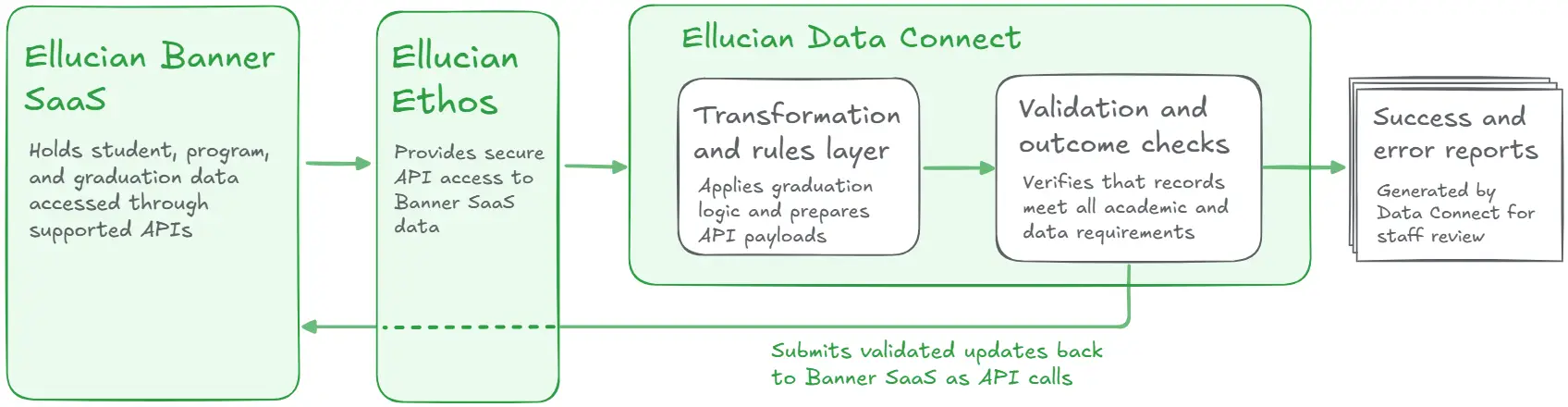 Data Connect became the new engine of the process. It retrieves the relevant student and program data through Ethos, applies the graduation rules, and prepares the next set of updates as API ready payloads. What used to be a tightly coupled series of SQL operations is now a clear sequence of extraction, transformation, and update tasks that run in the cloud.