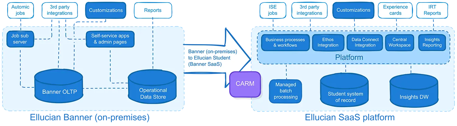 We align modernization decisions with Ellucian’s reference-model approach, including the Customer Architecture Reference Model (CARM), to help institutions map existing processes and workflows to SaaS-appropriate patterns without assuming one-size-fits-all implementations or Ellucian endorsement.